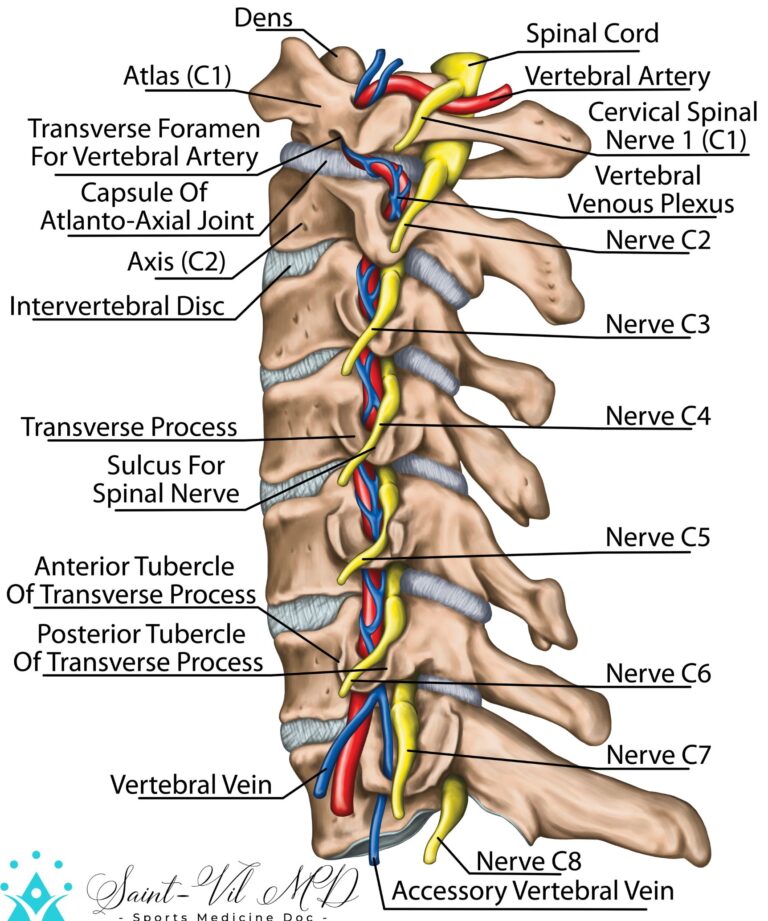 Back Cervical spine with both vertebral arteries in transverse foramen and the emerging spinal nerves. Topographic relationship of the spinal nerve and vertebral artery. Lateral view. Wisler Saint-Vil, MDAugust 7, 2022