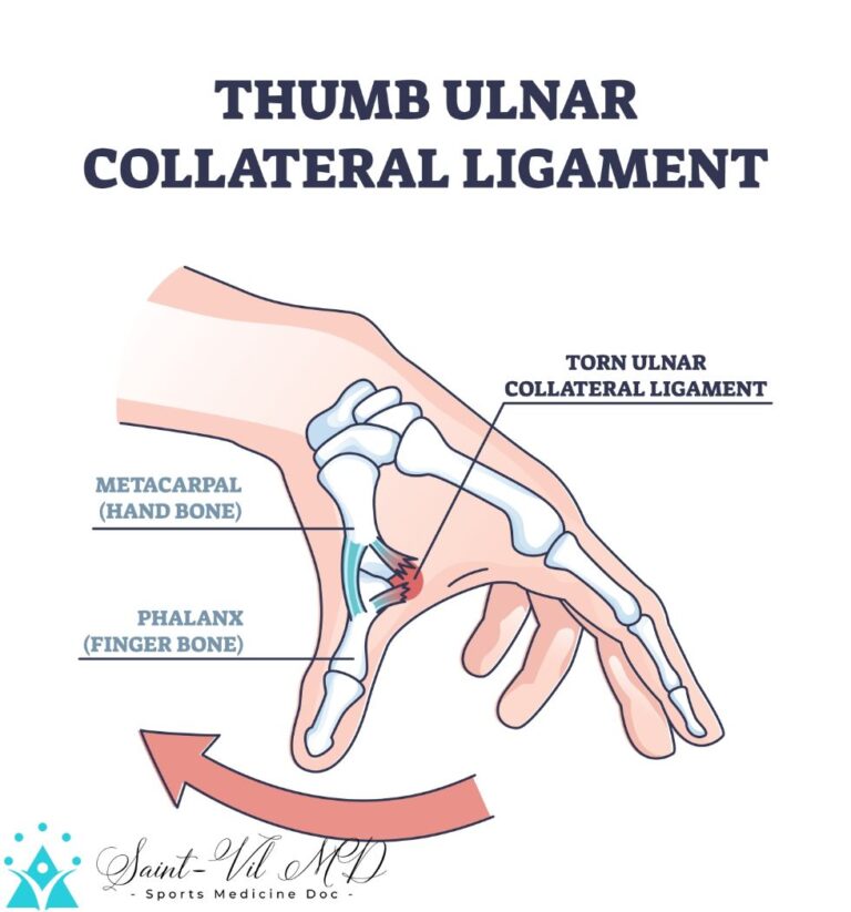 Hand & Wrist Thumb ulnar collateral ligament as finger injury and problem outline diagram. Labeled educational hand xray with bones and cartilage after medical condition and pain explanation vector illustration. Wisler Saint-Vil, MDAugust 2, 2022
