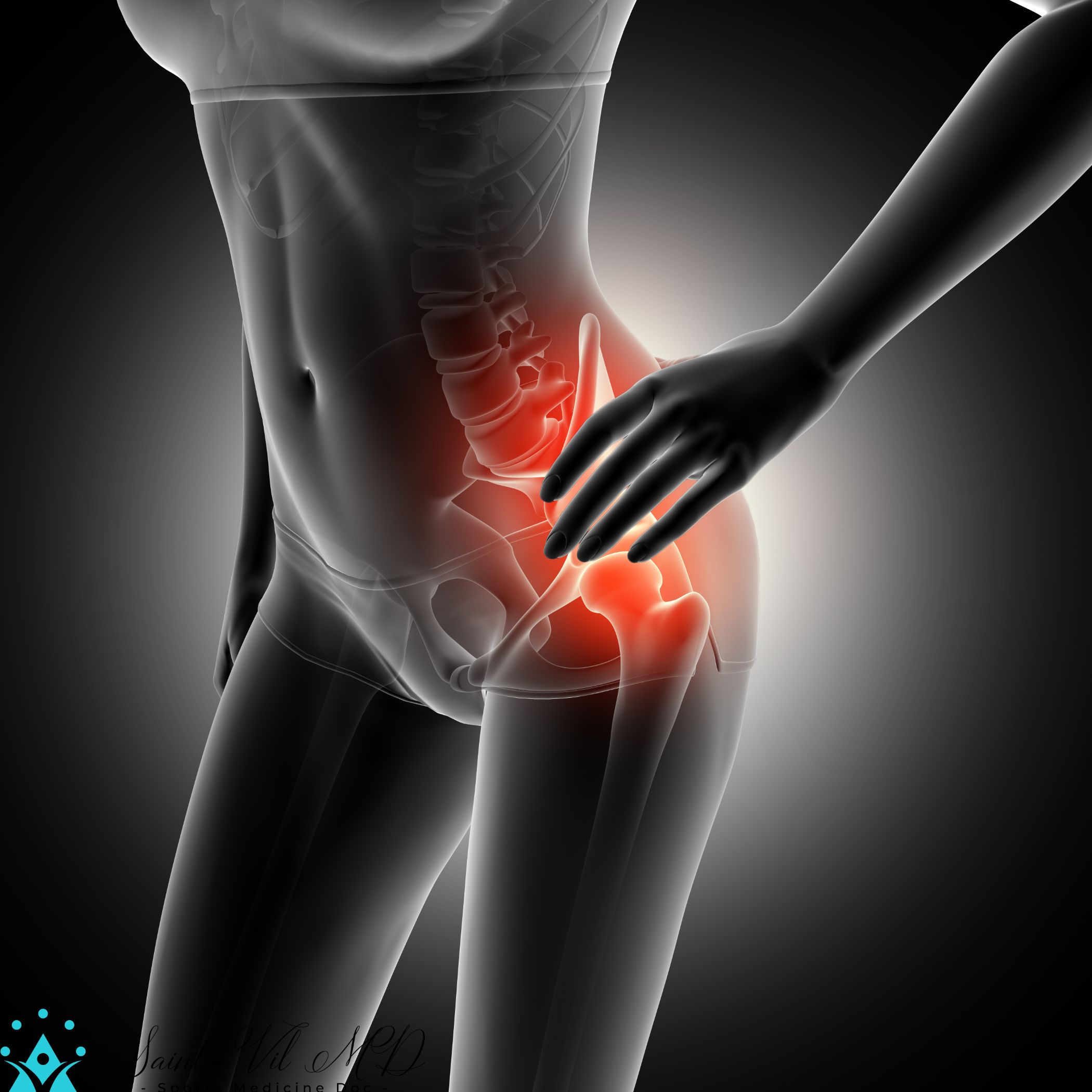 3D render of a female figure holding hip in pain with skeleton highlighted