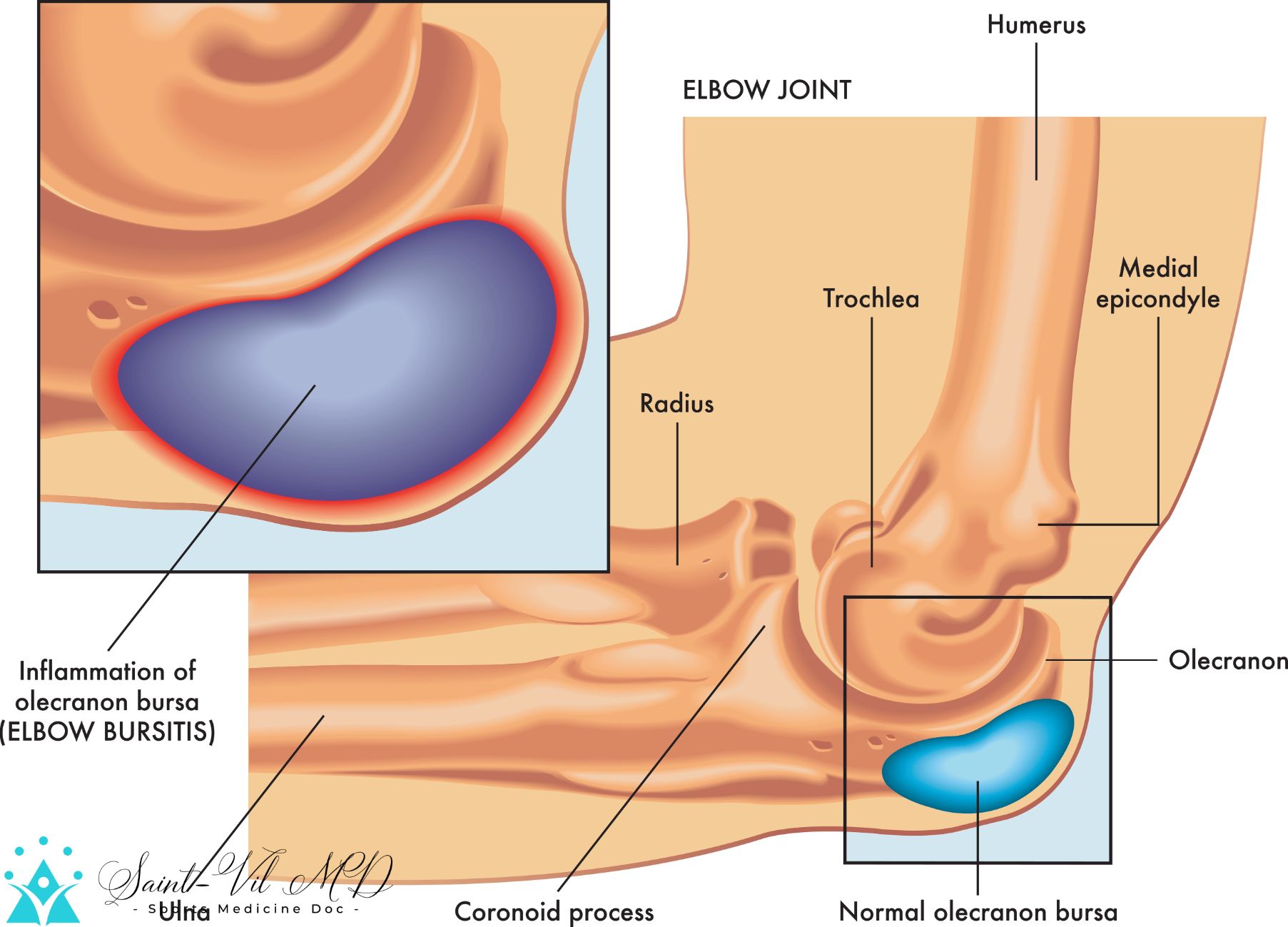 A medical illustration of elbow bursitis symptoms with annotations.Wisler Saint-Vil, MDAugust 3, 2022Foot & Ankle Wisler Saint-Vil, MD Sports Medicine Physician Marietta Memorial Sports Medicine department medical director Articles: 707 Previous Image Library patella pain cap knee tear Torn injury Swelling bone leg exercise muscle jumper’s runner’s bursitis tendon tibia Anterior Cruciate Ligament ACL sport femur painful it band rupture Trauma joint cyst Next Image Library Osgood-Schlatter Disease knee injury Jumper’s Knee arthritis chondromalacia spurt puberty pull athletes joint osteochondritis dissecans injuries