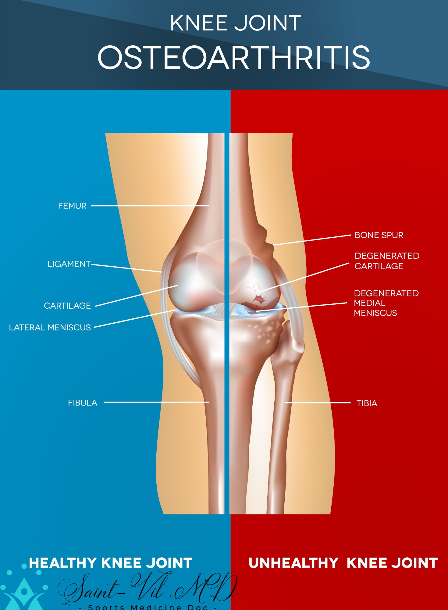 Osteoarthritis and normal knee joint colorful design, healthy half of the joint on a blue background and unhealthy on a red.