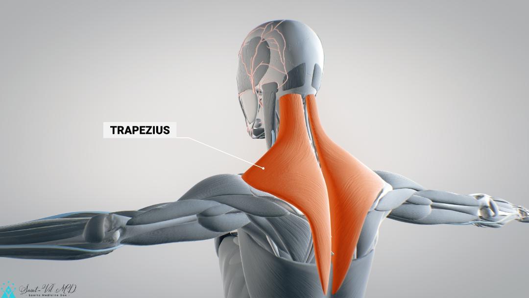 trapezius, human muscular system, 3D human anatomy, 3D render